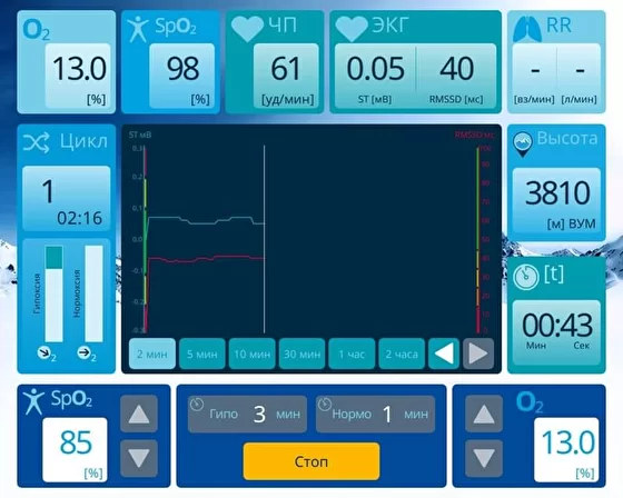 Во время процедуры аппарат подает в дыхательные пути попеременно воздух, обедненный кислородом (фаза гипоксии 9-16% — как будто вы поднимаетесь в горы), и воздух, насыщенный этим газом (фаза гипероксии 30-33% — как будто вы находитесь в барокамере).