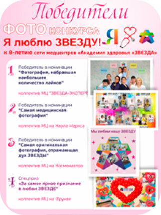Настало время подвести итоги фотоконкурса в честь 8-летия сети медицинских центров «ЗВЕЗДА». В конкурсе приняли активное участие как отдельные сотрудники, так и целые коллективы наших замечательных медцентров. Не зависимо от итогов конкурса, хочется поблагодарить всех участников, которые проявили настоящую фантазию, раскрыли свой творческий потенциал, создав тем самым настоящую атмосферу праздника!