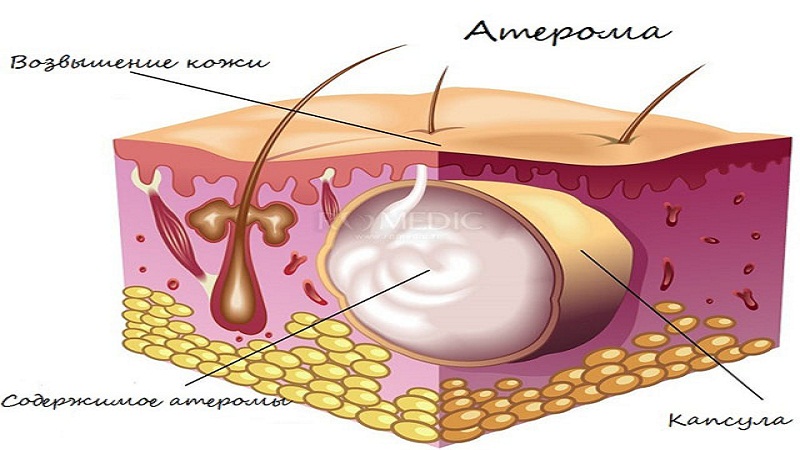 Атерома встречается у многих людей в основном на участках, с большим количеством сальных желез – на коже головы, лица, шеи, спины. Атерома – это киста сальной железы Причина ее возникновения – закупорка протоки железы. Скапливающийся секрет образует шарообразное новообразование, подвижное, легко смещается пальцами, мягкое с беловатым содержимым с неприятным запахом. Максимальный размер — до куриного яйца, обычно значительно меньше. Довольно часто со временем наблюдается увеличение размера атеромы. Атерома может быть единичной, могут быть группы по несколько штук.